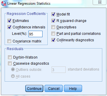 Once all of the data is formatted appropriately, it is time to generate the first multiple regression model. To do so, click on Analyze-> Regression-> Linear... This will open a window prompting you to specify the dependent and independent variables in your regression model. To do so, click on the measure in the column on the left and then click the arrow to the left of the category the variable belongs to (Dependent or Independent). Doing so will import the variable into the model. Before proceeding, click on the "Statistics..." button to customize your regression model outputs. I recommend entering the following settings: