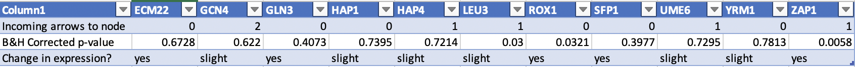 - The GRNsight model was used to make a table with the number of arrows incoming to each node as the first row.