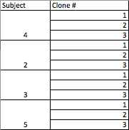 - We will use data from subjects 6, 8, 9, and 14 because these subjects have the most data across the most number of visits through the trial. This means that these subjects were most compliant to the protocols outlined by the ALIVE study researchers and therefore may have the least number of non-project related influences on their health. We will use all clone data from all available visits to generate the correlation analysis, adding up to a total of 64 clones. If we find an analysis procedure that allows us to use more clones, we will continue to add subjects according to the number of visits they completed.
