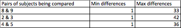 Clones from subject 3 are most genetically distant from clones from subject 2, 4, and 5 according to the unrooted tree produced with ClustalW. This means that subject 3 shares a older common ancestor with subjects 2, 4, and 5 than the common ancestor that subjects 2, 4, and 5 share with each other. The ClustalWDist Alignment Tool revealed that clones from subject 3 are most similar with each other in comparison with clones from subjects 15 and 7. However, this data may be skewed because subject 3 only has 4 clones while subjects 15 and 7 have 12 and 10 clones respectively. It makes logical sense that subjects with more clones would have more differences between them, so despite the statistical differences between these clones, nothing can be definitely said regarding the similarities of each of those subjects' clones. When comparing sequences between three pairs of subjects, it was found that subjects 8 and 9 have the most similar sequences as illustrated with the max difference value of 33. The other two pairs of subjects, 2 and 3, and 4 and 5, the differences are 42 and 36 respectively. This is representative of the analysis of the unrooted tree with clones from subjects 2, 3, 4, and 5 because subject 2 and 3 are less genetically similar than subjects 4 and 5. Overall, this project provided information regarding the similarities in genetic code between several subjects, as confirmed with unrooted trees, S values, Theta values, and min and max differences. These analyses confirmed that subject 3 is most different from subjects 2, 4, and 5.