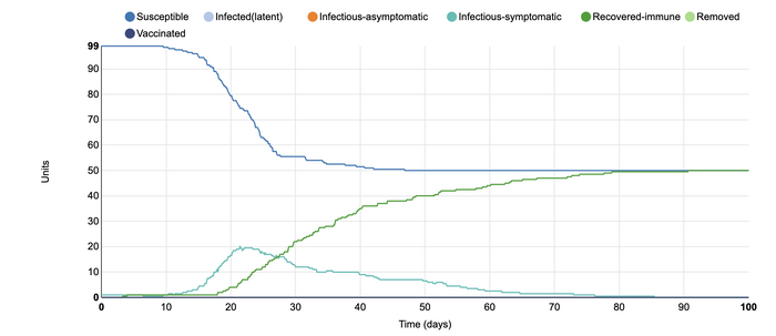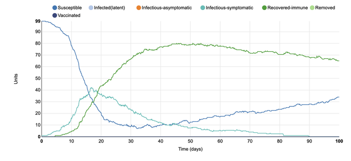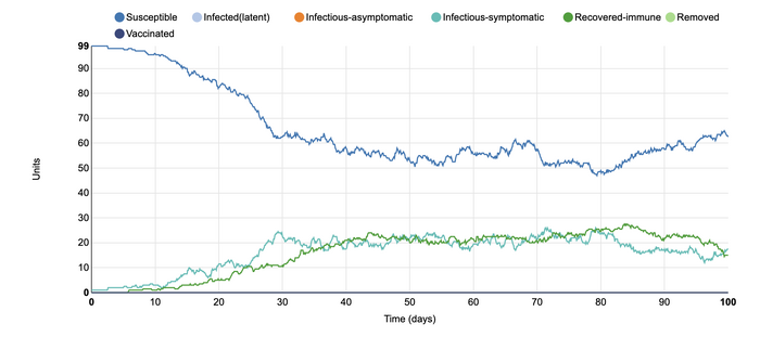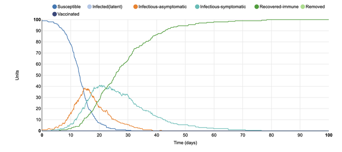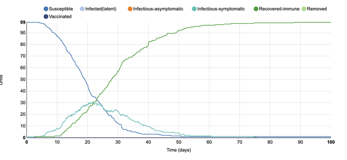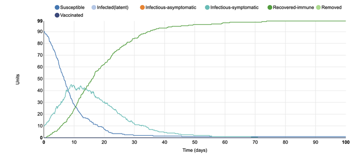In this model, I changed the number of infected units from the initial 1 unit to 10 units. In this simulation, it can be observed that the number of infected-symptomatic individuals rose more rapidly than in the initial graph. This is because, with more people who can expose others to the disease, it is likelier that more of the population will become infectious-symptomatic. However, this graph also shows that after about 40 days, most individuals were now recovered-immune. This contributes to the idea of flattening the curve,. The medical system can easily be overwhelmed if within this short amount of time such a large amount of individuals became infected. It would become much more difficult to manage the disease within the populations as doctors would have to start deciding who to treat first, leaving the more sick individuals to potentially suffer or die. Ultimately, this is an example of why social distancing is so important right now, as it is necessary for us to control the rate of infected-symptomatic.