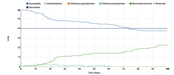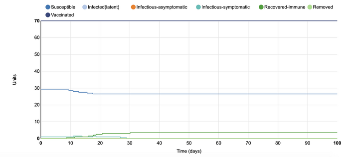 In this model, I added vaccination at 0.8 units. I wanted to see the effect that more vaccination within a population would have. In the first model with vaccination, I added 0.4 units of vaccinated individuals to the populations. That model showed that there were many more who were recovered-immune than the number of people who became infected. In that instance, the vaccine was able to successfully 'flatten the curve'. However, when a larger portion of the population receives a vaccine, the number of infected units did not rise higher than two. The rates were steady throughout the simulation, and vaccination appeared to be able to stop the disease from spreading throughout the units. This shows that if a vaccine comes out for COVID-19, it is very important that as many people receive it as possible. In this way, the rates of further infection can become more controlled as the more individuals are protected, the fewer infectious individuals (whether symptomatic or asymptomatic).