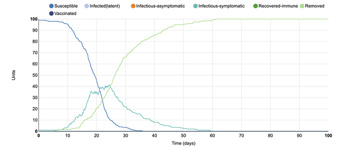 In this model, I added culling as a parameter. In this graph, the infected-symptomatic individuals have been shifted to the left of the graph, meaning it took more time for this to begin. Units were first culled at around the tenth day, when around two individuals were removed. By the end of the simulation, there were no units that were recovered-immune. Instead, the highest line appeared to be those who had been removed. It is interesting to see that culling results in the infection taking longer to occur. Initially, I anticipated this parameter change to merely ensure that people were infected at a much faster rate. However, this graph shows the opposite result.