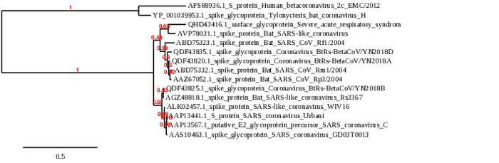- The generated tree and the class sequences have a lot of similarities. For example, the two outgroups, Human betacoronavirus 2c (AFS88936.1) and Trylonycteris bat coronavirus (YP_0010399), show a lot of similarity to one another in terms of the sequence. As they are both outgroups and depicted as sister taxa on the phylogenetic tree, we would anticipate this similarity. Outside of the outgroups, the rest of the sequences are divided into two primary groups. Every sequence comes off one of these larger nodes. For example, the spike protein of bat SARS CoV Rm1 (ABD75332.1) and bat SARS CoV Rp3 (AAZ67052.1) are similar to one another. This is visible throughout most of the sequence, and they are indeed sister taxa. however, this sequence is different from spike protein SARS-like coronavirus (AGZ48818.1). This can be seen as it has a more complete sequence with less missing amino acid residues. These results are expected as the phylogenetic tree was built directly off these sequences. Therefore, it can be anticipated that it separates the sequences based on the similarities and differences that are observable.