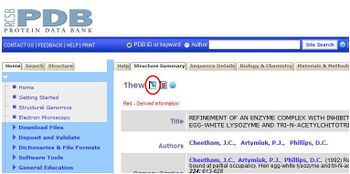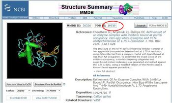 There are several ways to get structure files (.pdb files) for viewing in DeepView. DeepView can access pdb files from the Protein Data Bank directly, but I'll show you how to get to things via pubmed. For this tutorial, we want to work with Hen Egg-White Lysozyme in complex with the trisaccharide inhibitor tri-(N-acetylglucosamine). The ID code for the file we want is 1HEW.
