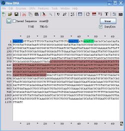 Let's focus on just the N-terminus of phoA, then. Open up your trace file and let's see where the read starts to get messy. It looks pretty good until at least 650. We won't worry about any similarity between the files after 650, then. Close the trace file--we're done with it. Now find bases 400-650 in your sequence file, select them, copy them, and find that string within pBca9145-Bca1126.str. That should have worked. If it didn't, try it again. Now you have a region of brown-colored sequence selected. Copy it, search for it in the calls file, and assuming the sequence gets highlighted within the calls file, paste in the annotated version. You now should have a little patch of sequence in there that looks like this: