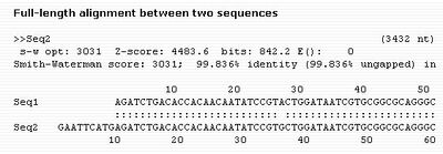 With bases 34-650 still copied to your clipboard, go to http://pir.georgetown.edu/pirwww/search/pairwise.html and paste the sequence the sequence into the top window. Select the entire file of pBca9145-Bca1126.str into the lower window and hit enter. This program will do a pairwise alignment between the two sequences and show you where they match and where they don't. You should get something like this: