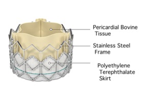 The valve is made up of three parts: tissue leaflets, metal frame, and a fabric skirt. The tissue leaflets are made of bovine pericardial tissue, similar to that of the Carpentier-Edwards valve model. A balloon-expandable stainless steel frame encases the leaflets. Also a polyethylene terephthalate skirt is attached for ease of implantation. Currently, Edwards Lifesciences manufactures this valve at two different sizes [1].