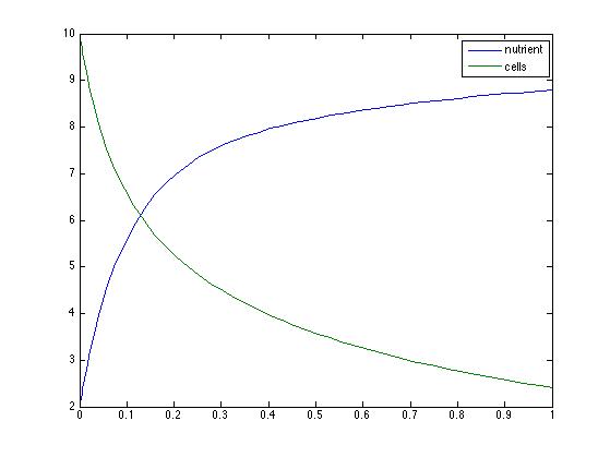 In this model the inflow rate, concentration inflow, growth rate, saturation, and consumption are all parameters. The dependent variables are the nutrient concentration and cell population and these are functions of time. There is one differential equation for the change in the nutrient concentration and one for the change in cell population over the change in time. By putting the differential equations into MATLAB the cell population and nutrient concentration can be observed given different parameters. For this first model I played with the five parameters mentioned earlier. After inputting different values I wanted to see what each parameter did to the cell population and nutrients when increased dramatically, while keeping the other parameters constant. The base values I used for each was 1 and for the consumption rate(or waste production) it was 0.1. When I changed the inflow rate from 1 to 10 I observed that the cell population approached zero and the nutrient levels increased. This result was more apparent when I increased the inflow rate to 100 volume units per unit time. Because we are at a constant volume in the chemostat this makes sense because inflow increasing the outflow and the cells aren't growing fast enough to maintain their population.The image below shows the plot before any parameters were changed.