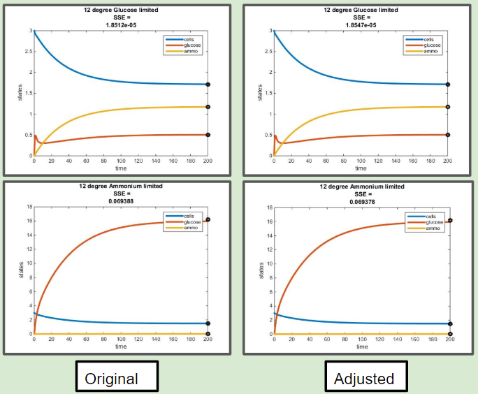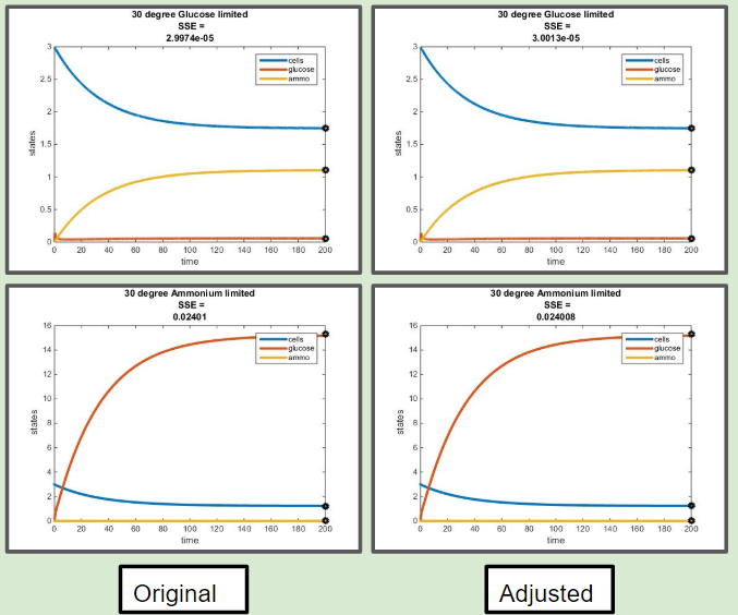 The objective of this assignment was to develop a MATLAB code that could model the chemostat used in Tai et al. (2007). The previous objective was to discover paramaters from this paper that could be applied to our MATLAB model. After performing this step, our next goal was to identify the activation energy and frequency factor constant, in addition to constructing a fuction of E (efficiency) in terms of y (residual glucose).