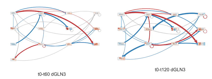 Extending the data to include timepoints up to t190 helped to reveal the complete story regarding this gene network and their expression both during cold shock and recovery periods. The inclusion of t90 and t120 drastically changed optimized results for threshold values, network weights, and production rates (Refer to graphs file in results section). However, the LSE:minLSE ratio was not improved by this modification. Within the network for the dGLN3 yeast strain, initially GLN3 had little affect on any of its target genes. Once the modification was made, GLN3 exhibited strong repression effect on MGA2. This network weight is important to consider because this strain did not contain dGLN3, so you would not expect this gene to have such a strong influence on MGA2. Between t0-t60 RAP1 has a somewhat strong influence on expression of YHP1 and repression on CRZ1 in the dGLN3 strain. However, both of these relationships are reversed when including all timepoints, suggesting a significant change in behavior of YHP1 and CRZ1 during the recovery period to allow the cell to return to its homeostatic condition.