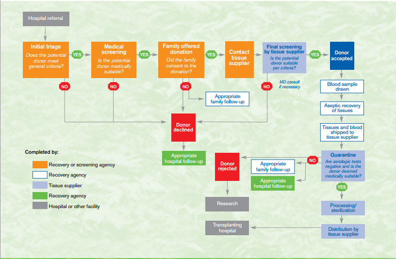 Tissue implantation are regulated by the FDA.However the regulation differ for each biological scaffold. Xenografts are considered as medical devices while autografts and allografts are viewed as a Human Cell and Tissue/Product by the FDA.In addition, due to the high degree of biocompatibilty, allograft and autograft are not sterilize before implantation compare to xenograft.In addition, the requirement for packaging and storage are set by the tissue bank.The picture below describe an overview of dermal donation process.
