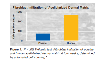 As we know, tissue repair are supported by fibroblast penetration,acellularization and remodeling. Fibroblast penetration in the site of graft is very important for tissue healing in the sense that it promote acellurization.Autograft and Allograft promote more infiltration of fibroblast compare to xenograth. This is due to the excessive cross link of the scaffold.Experiment perform on a human acellularized dermal matrix and porcine dermal matrix confirm a large amount of fibroblast at the site of grafts compare to bovine in which a large amount of fibroblast was found at a later time.The picture below show the degree of infiltration of fibroblast in human and bovine scaffold.Wound healing also occurs slowly in xenograft compare to allograft and autograft. Different studies suggest that the cross linking of the scaffold in xenograft reduce their permeability to the fibroblast which in turn slow the series of events require for proper wound healing.Remodeling occur after fibroblast infiltration and acellularization. During this stage,the newly implanted graft will try to accommodate to the new environment.If remodeling doesn't occur properly,tissue degradation and rejection could occur.[1].