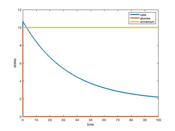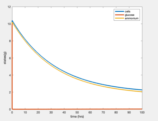 The graphs developed showed the ammonium and glucose abruptly leveling off in glucose's case and flat-lining for the ammonium which seems a bit off. The cells do show a steady decline however which would make sense appearing that a steady state was reached. The steady states in these graphs however do not match those in Tai et al's (2007) Table 1.