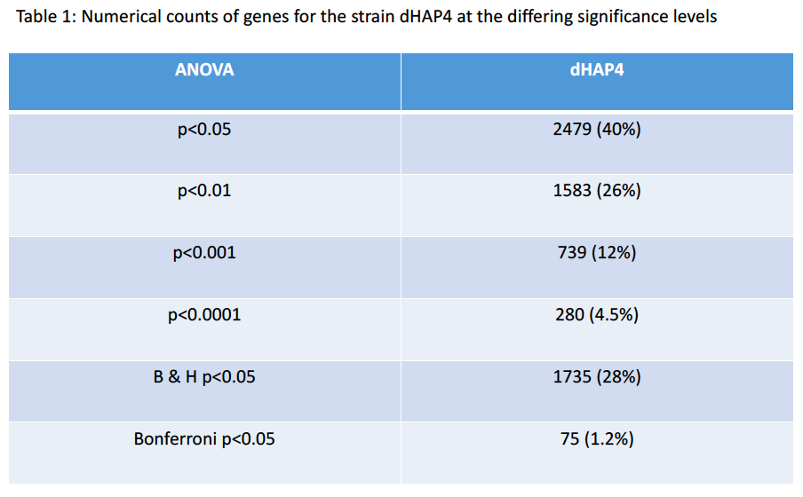 - How many genes are p < 0.05 for the Benjamini and Hochberg-corrected p value? and what is the percentage (out of 6189)?
