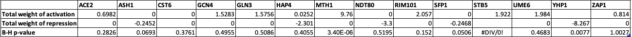 Table 2: Total weights of activation and repression, and Benjamini and Hochberg p-values for each gene