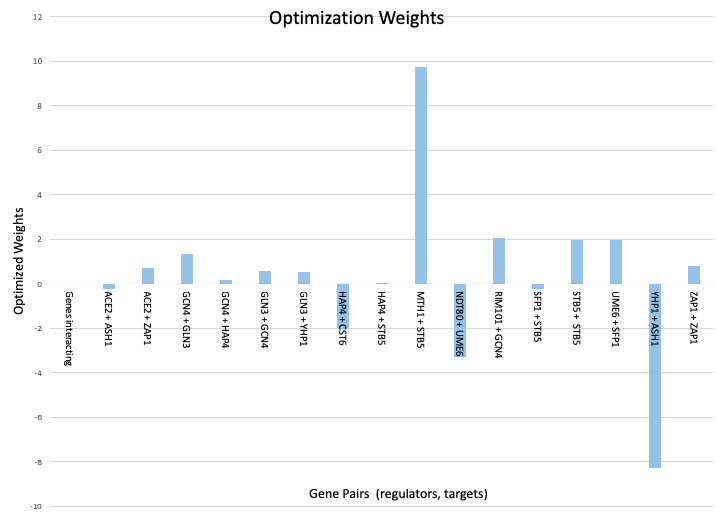 Figure 1: Bar chart displaying the optimized weights per gene interaction which was created as part of the week 6 assignment.
