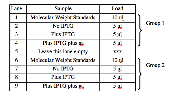 - Time to load the gels. Two groups will share each gel. Put on gloves, then load 5 μl of each sample in the order below. Once you have loaded a sample from one tube, move it to a different row in your eppendorf rack. This will help you keep track of which samples you have loaded.