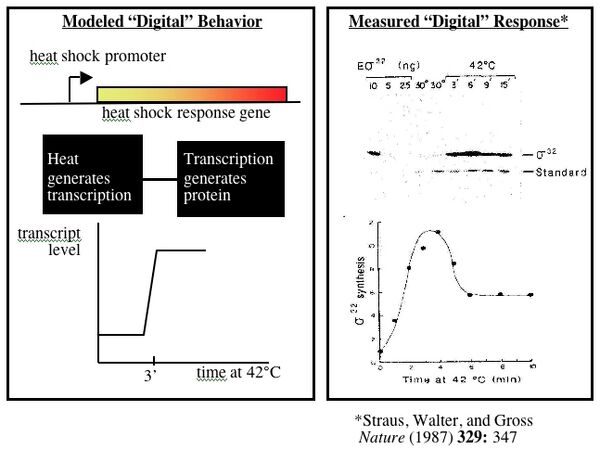 Biology is particularly well suited to model building since many natural responses appear digital. One example of genetically-encoded digital logic is the heat shock response in bacterial cells. E. coli grow happily at 37°C. Shift them to 42°C and a group of genes, collectively called the heat shock genes, are induced to keep the cell from overheating. The speed with which the induction occurs is remarkable. Full induction is measured in cells after only three minutes at the elevated temperature, allowing gene expression to be modeled as either “on” or “off.” The heat shock promoter can be considered one processing unit that converts environmental information (heat) into transcription units. The heat shock gene is a second processing unit, converting the transcription units generated from the first “black box” into a protein.