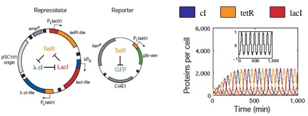 Biological responses are similarly noisy and inherent fluctuations lead to the heterogeneity of a cell population. As an example, consider again the “repressilator” plasmid that was introduced earlier (Elowitz and Leibler, Nature, 2000). The design, which mimics an electronic oscillator, should generate changing concentrations of three proteins (cI, tetR, and lacI), and flash GFP as a reporter for the tetR concentration. Simulations showed distinct peaks of the three proteins, temporally oscillating as intended, when modeled with a half dozen, coupled first-order differential equations. Periodicity was seen even when the system was modeled with more complex terms to account for confounding factors like cooperative binding, leaky promoters and different rates of mRNA decay.