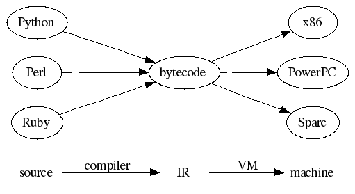 This is what people do in practice, because it is substantially less work for the people who have to make the translators. The Parrot VM (http://en.wikipedia.org/wiki/Parrot_virtual_machine), currently under development, will support all of the languages and machines mentioned here, plus more.