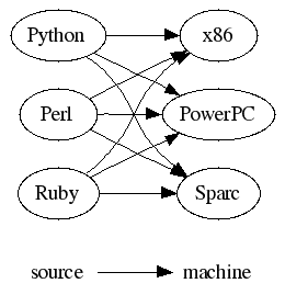 Suppose you write a program in Python and you want it to run on the Sun machine in the Athena cluster, and on the x86 Athena machine, and on your Mac at home. How many translators would have to exist to allow you to do this? At least three. And what if you also wanted to write programs in Perl, Ruby, Scheme, etc, and have them run on all of those different kinds of computers? If you wrote a translator from each source language to each machine type, you'd need L*M translators (where L is the number of source language and M is the number of machine types). It would look sort of like this: