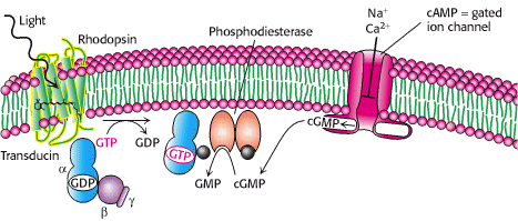 Transducin, a G protein, which is made up of three different subunits: Tα, which is the guanyl nucleotide binding subunit, T β , and Tγ . In the dark, with GDP bound, transducin is peripherally associated to the cytoplasmic disc surface. In the first step of the light triggered cascade, photoactivated rhodopsin (R*), the photoisomerized protein, forms a transient complex with transducin and catalyzes on it a GDP/GTP exchange. GTP-bound transducin binds to and activates a cGMP phosphodiesterase (PDE), which converts cGMP to GMP. Cyclic GMP is formed from GTP by guanylate cyclase and is hydrolyzed to 5’-GMP by the phosphodiesterase as Figure 4. The concentration of cGMP decreases below what is required to open cGMP-gated ion channels of the rod, reducing the flow of ions across the cellular membrane. (Fung, B. K. et al, 1981)