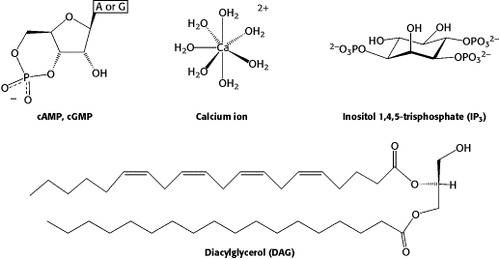Secondary messengers are a class of small molecules used to transduce extracellular signals to the interior of the cell. Most hormones such as epinephrine and seratonin are too large or too polar to freely pass through the plasma membrane of a cell. For example, second messengers are often free to diffuse to the nucleus, where they can influence gene expression and other processes. The use of a membrane-bound protein with intra- and extracellular domains allows information to pass through the membrane without any exchange of contents. In addition to transducing a signal through the membrane, the use of secondary messengers allows for signal amplification since one bound primary messenger can stimulate the production of many secondary messenger molecules. For instance, enzymes or membrane channels are almost always activated in second-messenger generation; each activated macromolecule can lead to the generation of many second messengers within the cell. Thus, a low concentration of signal in the environment, even as little as a single molecule, can yield a large intracellular signal and response. Secondary messengers can be either small organic molecules such as cyclic adensine monophosphate (cAMP) , guanosine 3',5'-(cyclic)phosphate (cGMP), diacylglycerol (DAG) and inositol 1,4,5 triphosphate (IP3) or inorganic ions such as Ca2+ (Stryer, 2005).