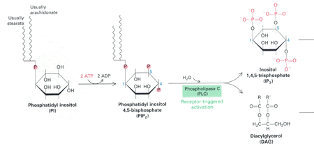 A wide variety of G protein-coupled receptors link to phospholipase C (PLC), intracellular enzyme, to hydrolysis of phosphatidylinositol-4,5-bisphosphate (PIP2)generating inositol 1,4,5-trisphosphate (IP3 ) and diacylglycerol (DAG). These two second messengers in turn regulate intracellular Ca2+ concentration and protein kinase C activity.