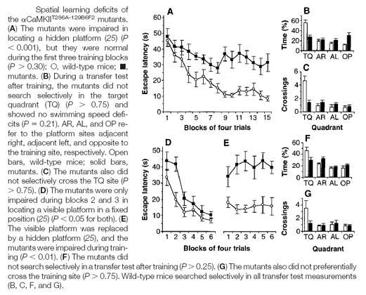 [Mutant mice had a point mutation introduced into their CaMKII gene at Thr 286 and showed no NMDA-mediated LTP during spatial learning tasks in the Morris water maze. Giese et. al, 1998]