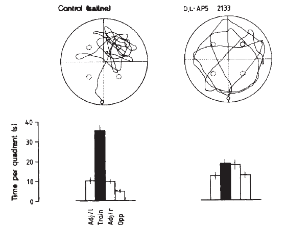 [Rats were treated with either AP5 or saline and trained to find a platform in a pool of opaque water. Swimming paths taken by rats in control and AP5 treatment group are shown. Computerized tracking systems compared the amount of time each animal spent in each quadrant of the tank and scores for each group were tallied. The mean time spent in the training quadrant were: Control- 35.4 + 2,2s (59%); AP5- 18.2 + 2.0 s (30%). Morris et. al, 1986]