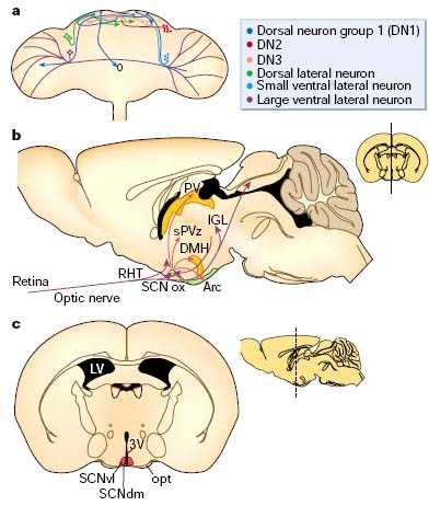 The circadian pacemaker in Drosophila is composed of six cell types, with only between 4 and 40 cells of each type (Fig. 2a). One of these types controls the morning activity level, three are synchronized with the evening activity level, and the other two have unknown function (Stoleru, 2005). In mice, the suprachiasmatic nuclus (SCN) of the hypothalamus contains the circadian pacemaker (Fig. 2b, c).