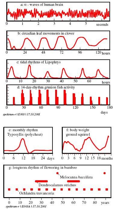 The study of biological rhythms, which pacemakers control, is one of the oldest fields of science. They are mentioned in the writings of Aristotle (384-322 BC) (Ward, 1971). The periods of biological rhythms range from sub-microsecond in the electric organ of eels (Moortgat, 1998), to 24 hours in circadian rhythm, to 1 month in the menstrual cycle, to 12 months in hibernation, to longer than 1 year in the flowering cycle of bamboo (Fig. 1).