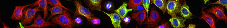 GEHealthcare image of HeLa cells treated with a compound which modifies a microtubule subset (green). Stained for total tubulin (red) and DNA (blue).