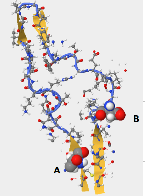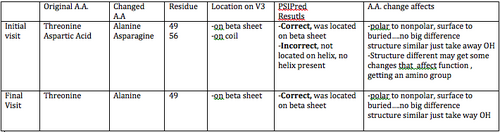 - I downloaded Huang et al. (2005) Structure 2B4C into StarBiochem and adjusting the size of atoms and secondary structure, I was able to obtain a clear picture of the V3 region on the protein an then look at the amino acids that corresponded to the ones that changed in Psipred.