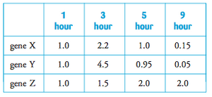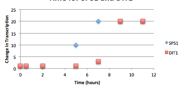- (Question 5, p. 110) Choose two genes from Figure 4.6b (PDF of figures on MyLMUConnect) and draw a graph to represent the change in transcription over time. You can either create your plot in Excel and put the image up on your wiki page or you can do it in hard copy and turn it in in class.