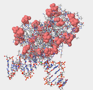 - Method: to make DNA segment more visible. In the Nucleic Acid tab, I moved the Atom size slider to right by 35% and in the Protein>Primary tab I moved the Atoms Size slider completely to the left and the Bonds Translucency slider to the right by 95%.