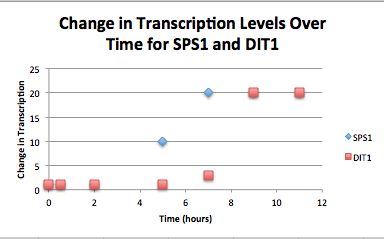 This graph shows the change in transcription levels over time for SPS1 (blue) and DIT1 (red). SPS1 and DIT1 overlap at the same transcription level at the tree time periods between 0 and 2 hours.