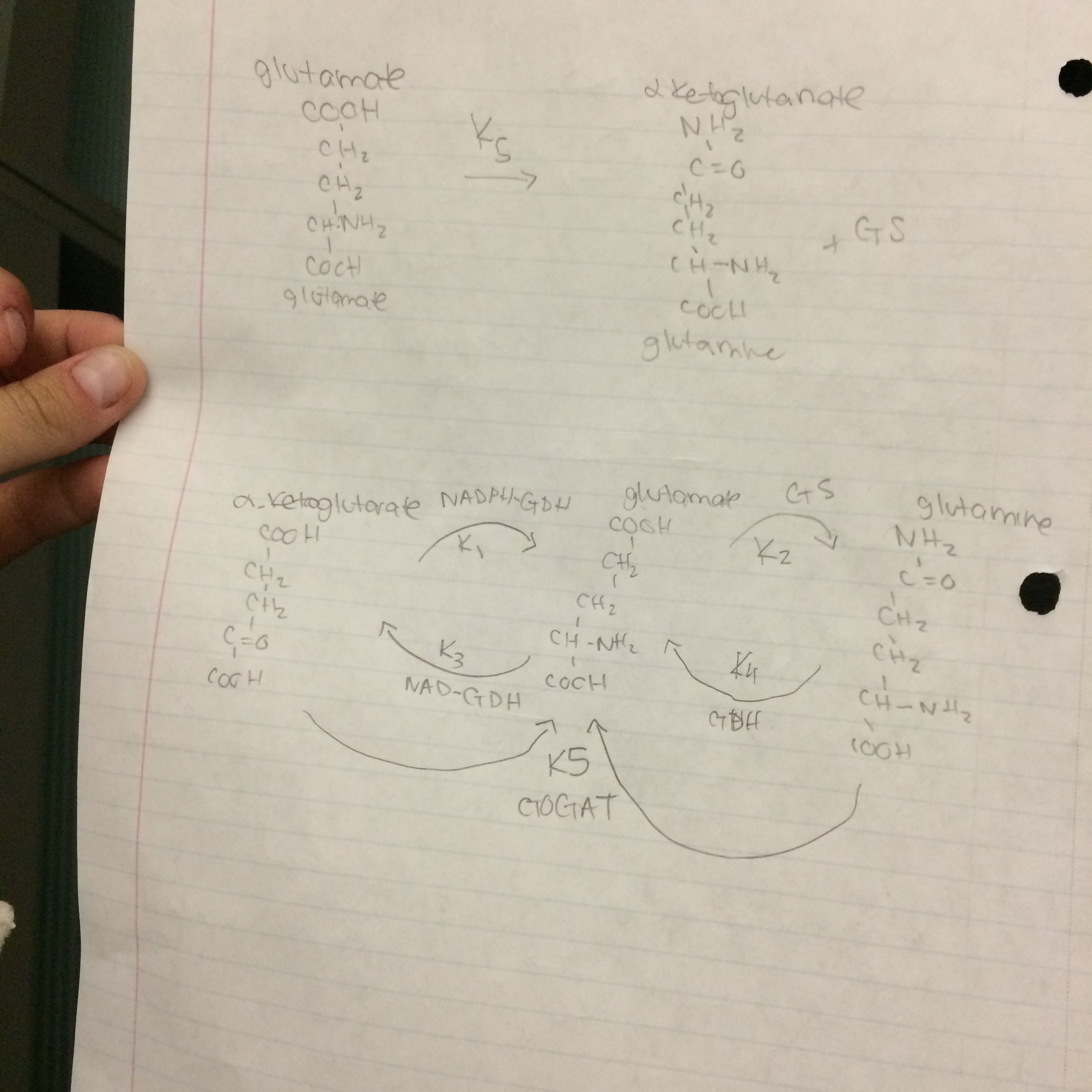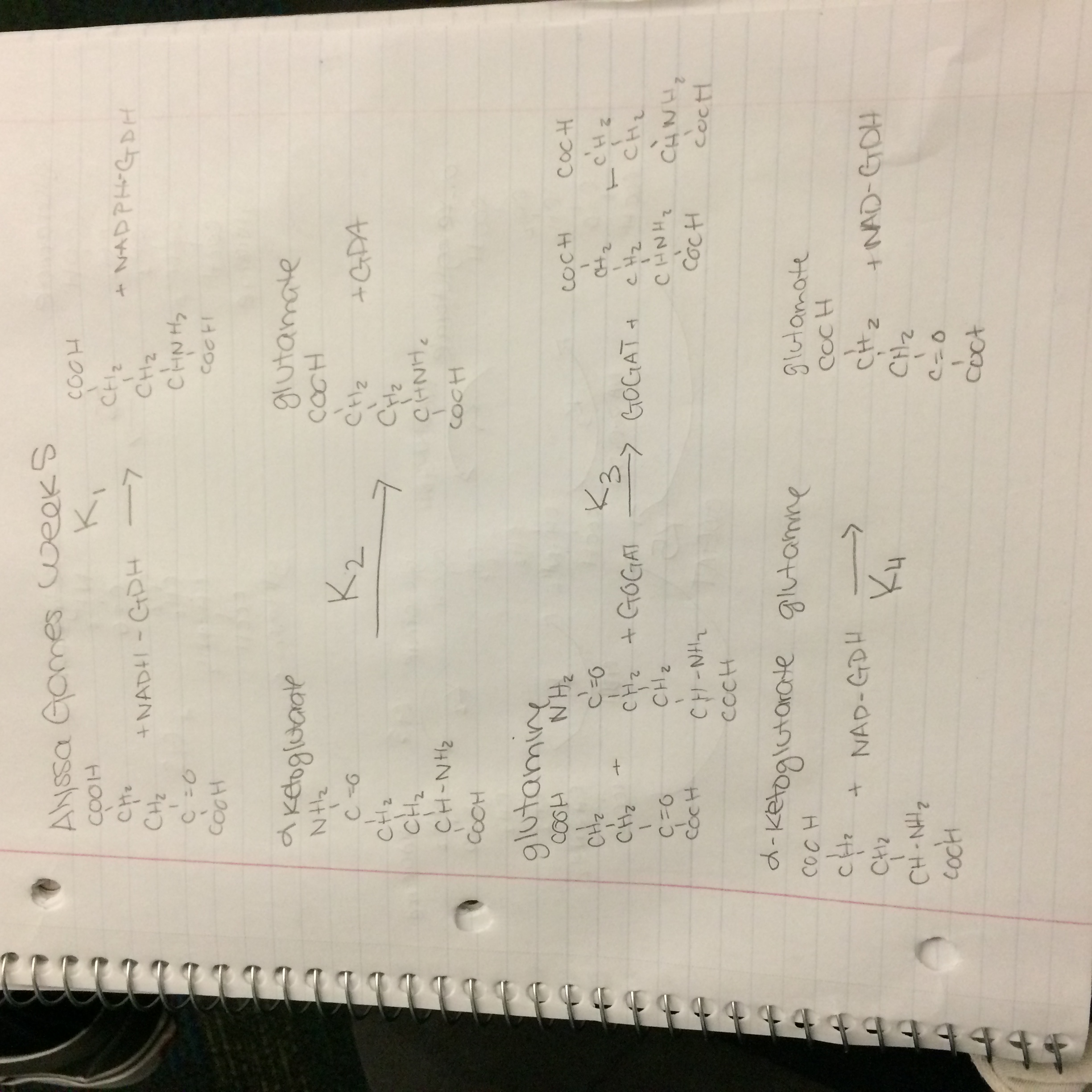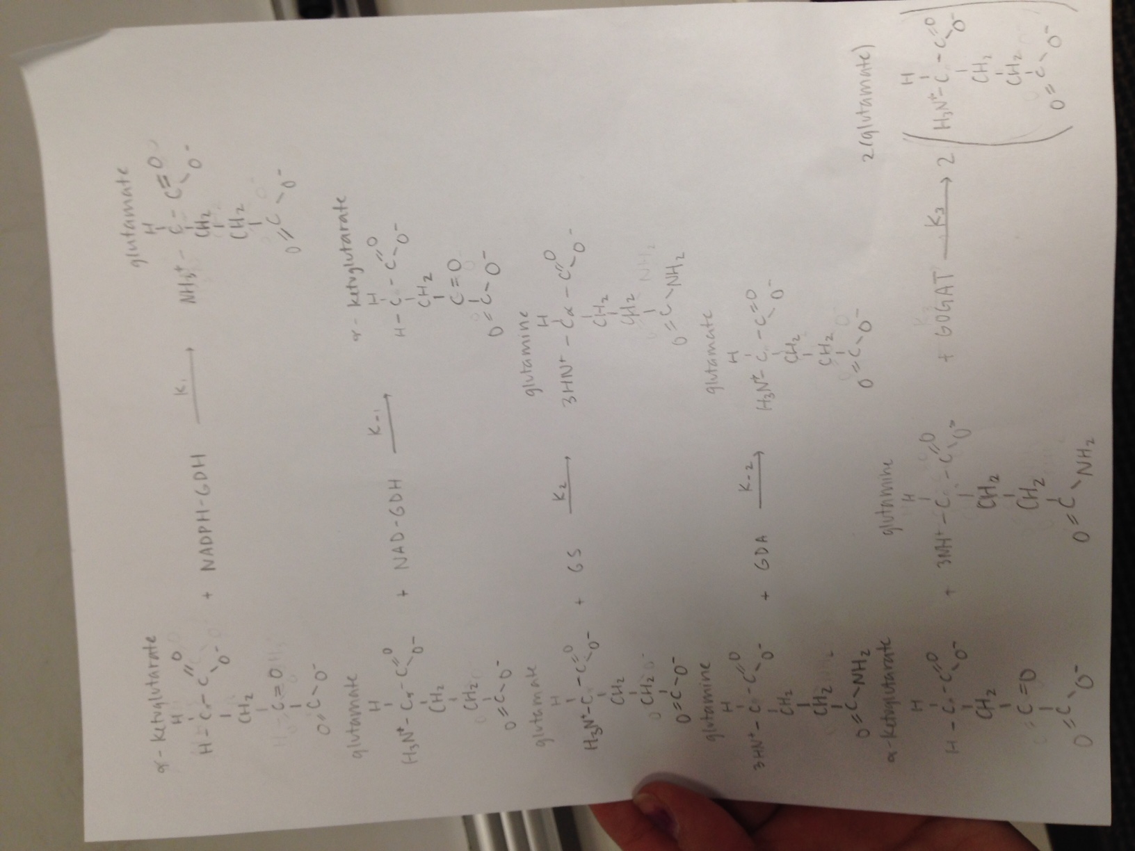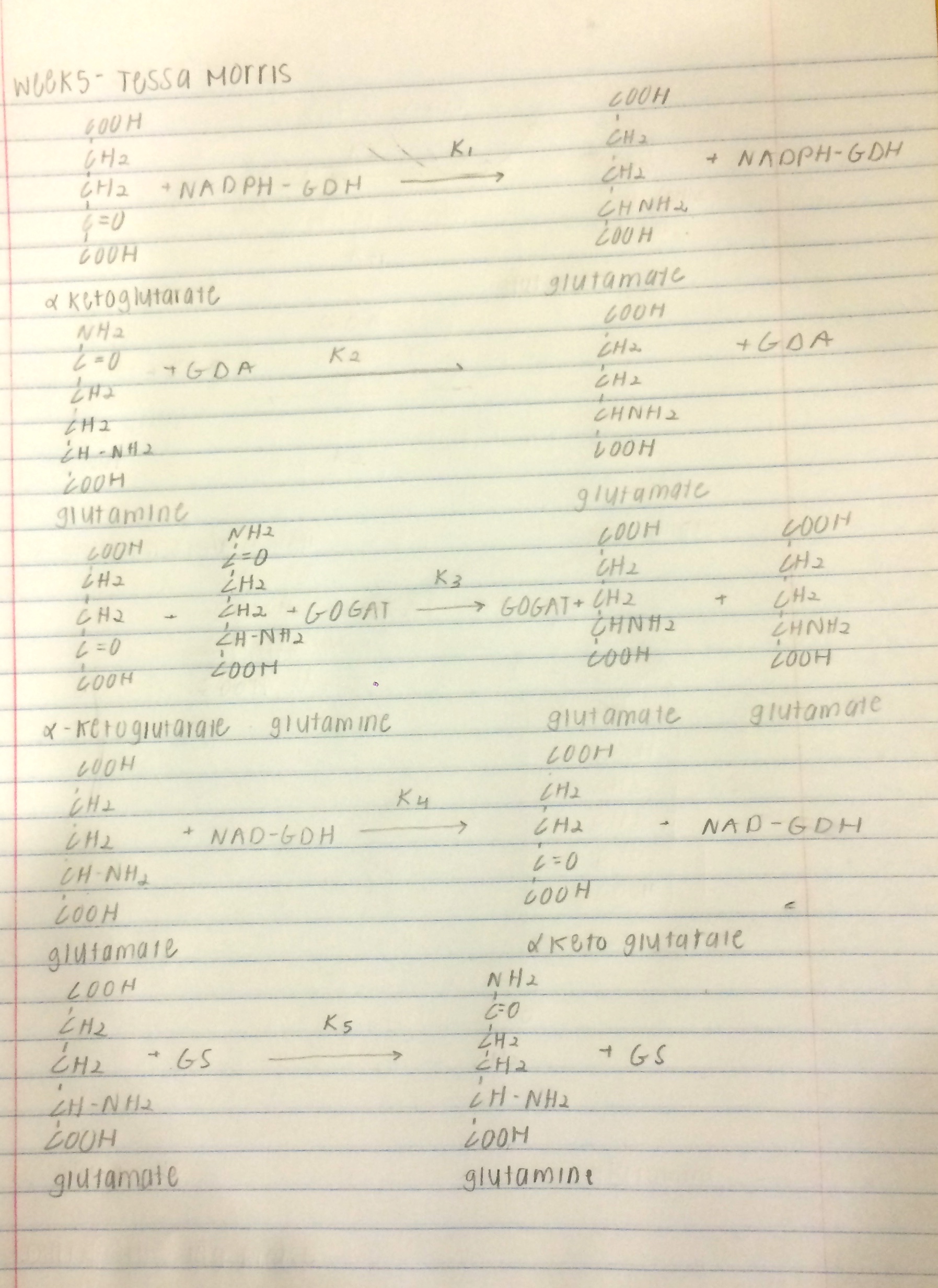 - In the reaction graph, one can see that a product from one reaction becomes the substrate for the next reaction. For instance, glutamine can't be produced until enough glutamate is added to glutamine synthetase. In the same chain, glutamate can't be produced until enough concentration of alpha-ketoglutarate is added to NADPH-GDH. This sort of chain reaction that is seen in the graph could relate to yeast in their lag phase of growth, which is testing their environment before they react.