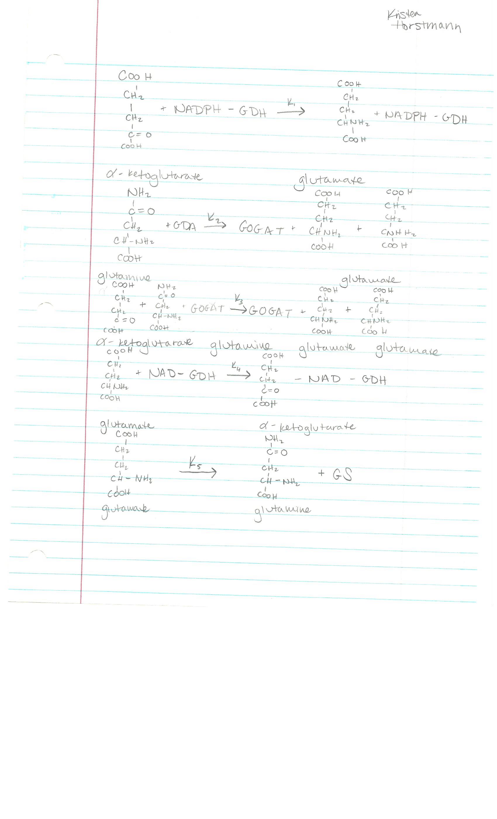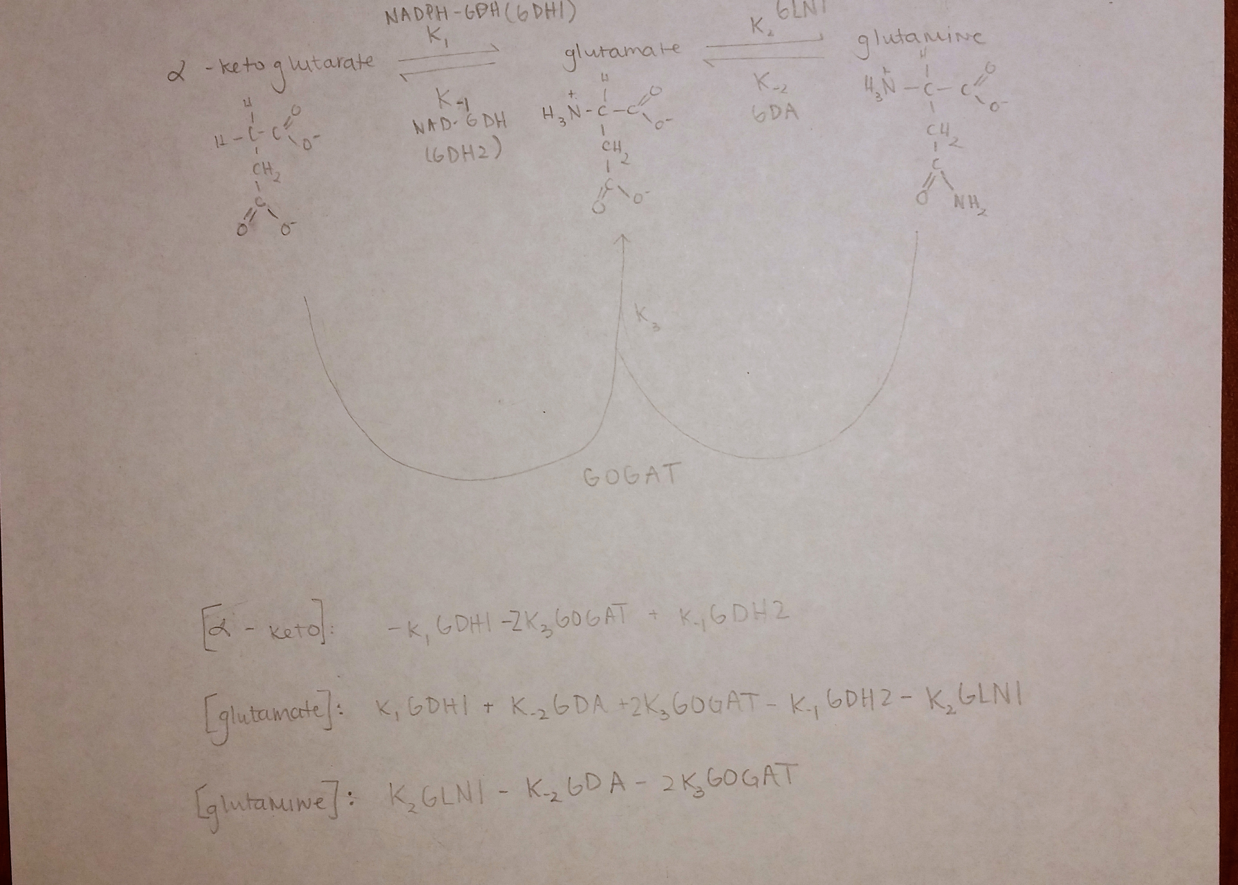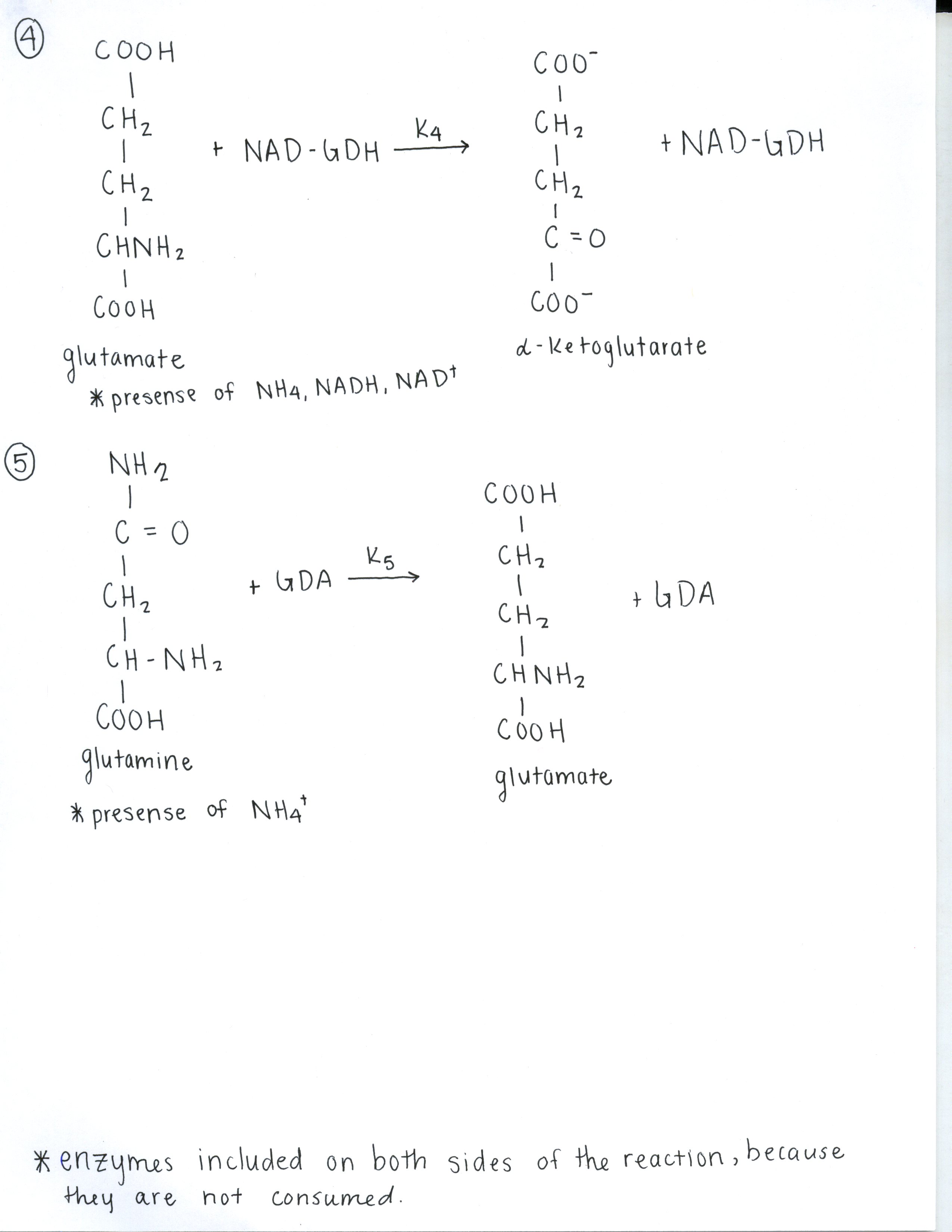 - Click here to view the chemical reaction graph that defines the five enzyme reactions in yeast's nitrogen metabolism. A rate constant (kn) is included for each reaction arrow. The three product/substrate quantities are alpha-ketogluterate, glutamate, and glutamine.