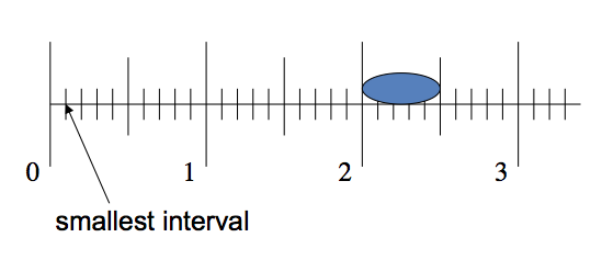 Cell size can be measured using an ocular micrometer. A micrometer has been installed in one of the ocular lenses of each microscope in the laboratory. As you can see below, it looks like a small ruler with both large and small units. The large units are numbered 1, 2, 3, etc. The small units are subdivisions of the large units and are not numbered. There are 10 small units per large unit.