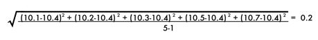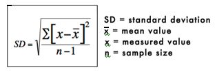 The standard deviation is a measure of how spread out or variable the values are. The standard deviation is calculated by subtracting the mean from each value and then squaring and summing these values. The resulting value is divided by n-1, where n is the number of values. The square root of these values is the standard deviation. The standard deviation is represented mathematically as: