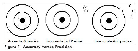 When carrying out an experiment, it is important to do the experiment more than one time to be sure that your measurements are accurate and as precise as possible. Accuracy is the degree of agreement between the measured value of a particular component and the accepted true value. Precision is defined as the degree of agreement between replicate measurements of the same component. Precise measurements do not necessarily indicate accurate measurements. Figure 1 uses targets to illustrate the difference between accuracy and precision. If the bull’s eyes in the targets below represent the true value, then the darts that are the closest to the center of the target are the most accurate. Darts that are not near the center of the target are not accurate even though they may be very closely grouped together indicating good precision. Finally, the darts that are not near the center or grouped together are neither accurate nor precise. Measured values that are both accurate and precise are the goal of all analytical procedures.