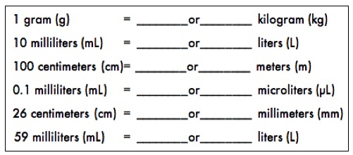 It is important to become familiar with measurements expressed in metric units and to be able to convert between these units (from grams to milligrams, for example). Conversions are straightforward since the power of ten between each unit is known. Since there are 1000 milligrams in each gram, a sample that weighs 1 gram also weighs 1000 milligrams. To keep track of the decimal point, 1000 milligrams is best written in scientific notation as 1.0 x 103, mg.