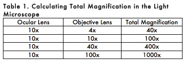 Total magnification of the specimen is determined by multiplying the magnifying power of the ocular and objective lenses. For example, a 10X ocular and a 40X objective together give a total magnification of 400X (Table 1). This means that the specimen appears 400 times larger when viewed with a microscope than its actual size.