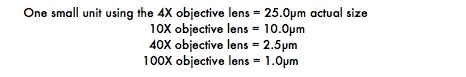Therefore, if you are observing a cell with the 40X objective, and this cell spans 2.5 small units on the ocular micrometer scale, then the size of the cell is calculated by multiplying 2.5 small units x 2.5µm/small unit = 6.25µm. You should always calculate size of any object that is the focus of a figure in a photomicrograph for a scientific paper. Because digital imaging allows manipulation of size post-viewing, giving the total magnification is sometimes misleading. You should calculate and give the size of any important object in the figure legend.