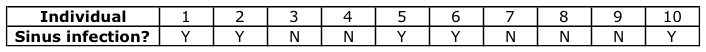 3. You are interested in investigating whether the SNP at position 785 of the TAS2R38 gene is associated with susceptibility to sinus infections. Use the gel electrophoresis data (from question 2) and the phenotype data (below) to determine if there is an association between the 785 SNP and sinus infection.