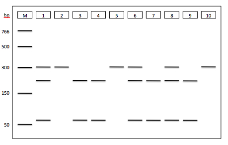 2. A section of the TAS2R38 gene (spanning the SNP at position 785) was amplified by PCR using DNA from 10 individuals as templates. The PCR products were digested with Fnu4H1 and the digested PCR products were separated by agarose gel electrophoresis. Use the results from the gel below to answer the following questions (2 and 3).