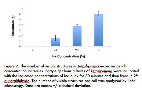 The data generated from your experiment can be presented as a bar graph. Using Excel, you will be able to plot the number of visible structures per cell on the Y axis and the ink concentration on the X axis. Begin by determining the mean and standard deviation for the number of structures seen at each ink concentration. Generate a graph similar to the one shown in Figure 2 and include it in your lab notebook. It is ok if you need to make a slightly different graph because you designed your experiment differently. IMPORTANT NOTE: The data in Fig 2 is hypothetical, so it is ok if your data is not consistent with the Fig 2 data. See Appendix A for instructions.