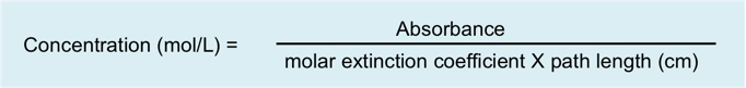 The molar extinction coefficient is a constant that is dependent upon the chemical nature of the absorbing material and the wavelength employed for the absorbance measurement. The path length is determined by the width or diameter of the cuvette used to contain the sample.  Absorbance is unitless.